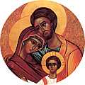 Tavola icona raffigurante la Sacra Famiglia. Questa immagine è una stampa su tavolo in legno. Il quadro può essere appeso alla parete grazie al foro che c'è sul retro.Dimensioni: 32 x 25 cm. Prodotto in Italia.