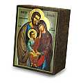 Tavola raffigurante l'icona bizantina della Sacra Famiglia.L'immagine si presenta stampata con oro a caldo.La tavola può essere appesa grazie al foro apposto sul retro o appoggiata su un piano.L'articolo è particolarmente curato con attenzione ai dettagli.Dimensioni: 6,5 x 4,5 cm. Materiale: legno. Realizzato artigianalmente in Italia.