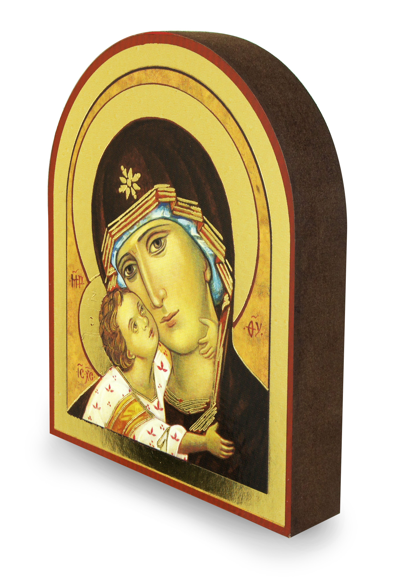 Tavola raffigurante la Madonna della tenerezza di Vladimir, una delle icone ortodosse più famose del mondo.L'immagine si presenta stampata con oro a caldo e con un piccolo bordo laterale colore bordeaux.La tavola può essere appesa grazie al foro apposto sul retro o appoggiata su di un piano.L'articolo è particolarmente curato con attenzione ai dettagli. Peso: 700 gr. Materiale: legno. Dimensioni: 22 x 17,5 x 2,5 cm.Realizzato artigianalmente in Italia.