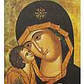 Tavola raffigurante la Madonna della Tenerezza di Vladimir, una delle icone ortodosse più famose del mondo.L'immagine si presenta stampata con oro a caldo e con un bordo dorato.La tavola può essere appesa grazie al foro/gancio che c'è sul retro o appoggiata su di un piano.L'articolo è particolarmente curato con attenzione ai dettagli. Materiale: legno. Dimensioni: 14 x 11 cm.Realizzato artigianalmente in Italia.