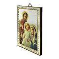 Tavola in legno raffigurante la Sacra Famiglia. L'immagine è una stampa di carta lucida su legno, con finiture a caldo in oro e argento. La tavola può essere appesa grazie al gancio che c'è sul retro.Materiale: legno. Dimensioni: 10 x 14 cm. Verrà consegnato in una scatola trasparente.Realizzato artigianalmente in Italia.