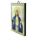 Tavola in legno raffigurante il Sacro Cuore di Maria.L'immagine è una stampa di carta lucida su legno, con finiture a caldo in oro e argento. La tavola può essere appesa grazie al gancio che c'è sul retro.Materiale: legno. Dimensioni: 10 x 14 cm. Verrà consegnato in una scatola trasparente.Realizzato artigianalmente in Italia.