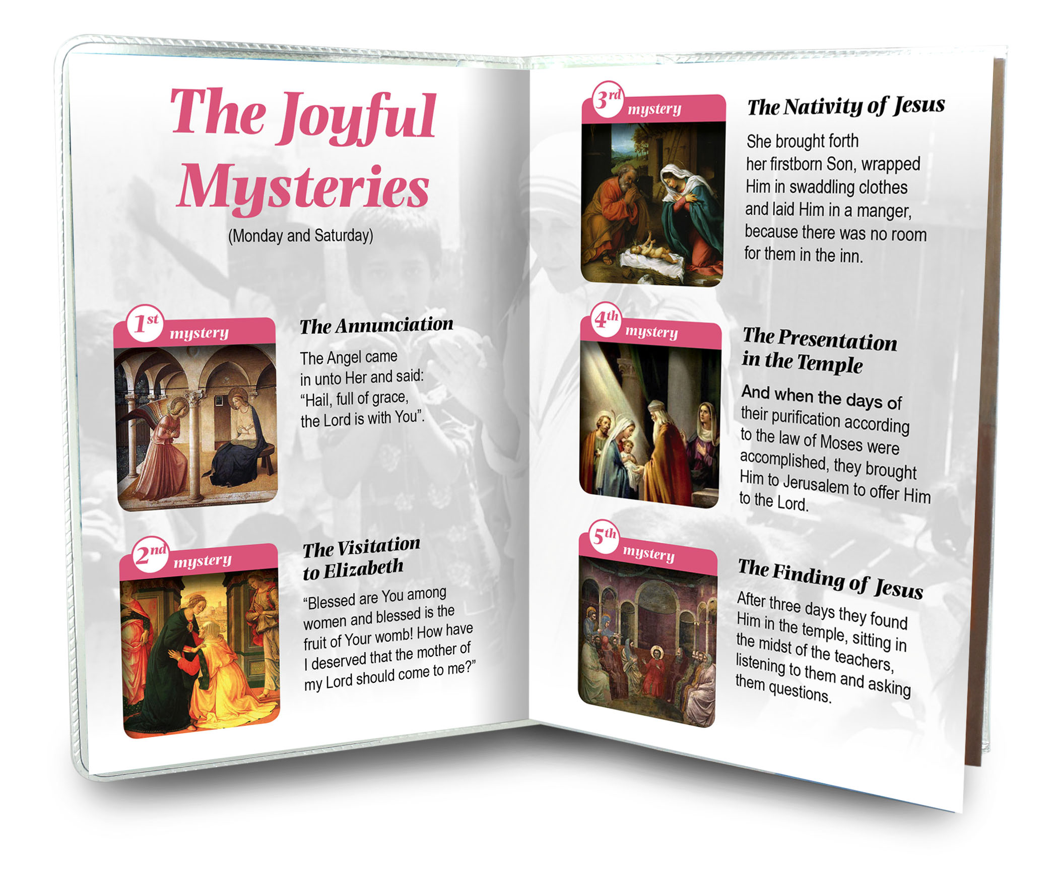 Il libretto, composto da 20 pagine, si presenta con una copertina in plastica trasparente e nell'interno vi è un piccolo rosario con i grani tipo perlina del diamero di mm 4. Nell'interno troviamo la spiegazione di come recitare il Santo Rosario e una preghiera dedicata a Santa Madre Teresa di Calcutta.La misura è di cm 9,5 x14,5. Realizzato e stampato in Italia. (Il rosario potrebbe variare in base alla disponibilità)