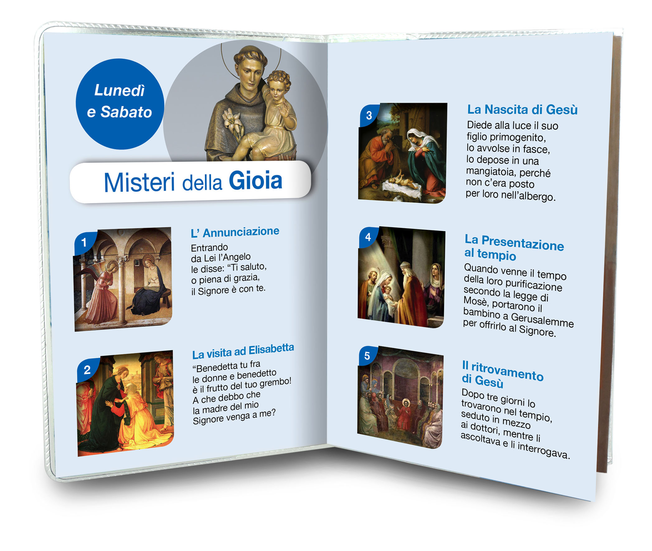 Il libretto, composto da 16 pagine, si presenta con una copertina in plastica trasparente e nell'interno vi è un piccolo rosario con i grani tipo perlina del diamero di mm 4. Nell'interno troviamo la spiegazione di come recitare il Santo Rosario ed una preghiera dedicata a Sant'Antonio di Padova.La misura è di cm 9,5 x14,5. Realizzato e stampato in Italia. (Il rosario potrebbe variare in base alla disponibilità)