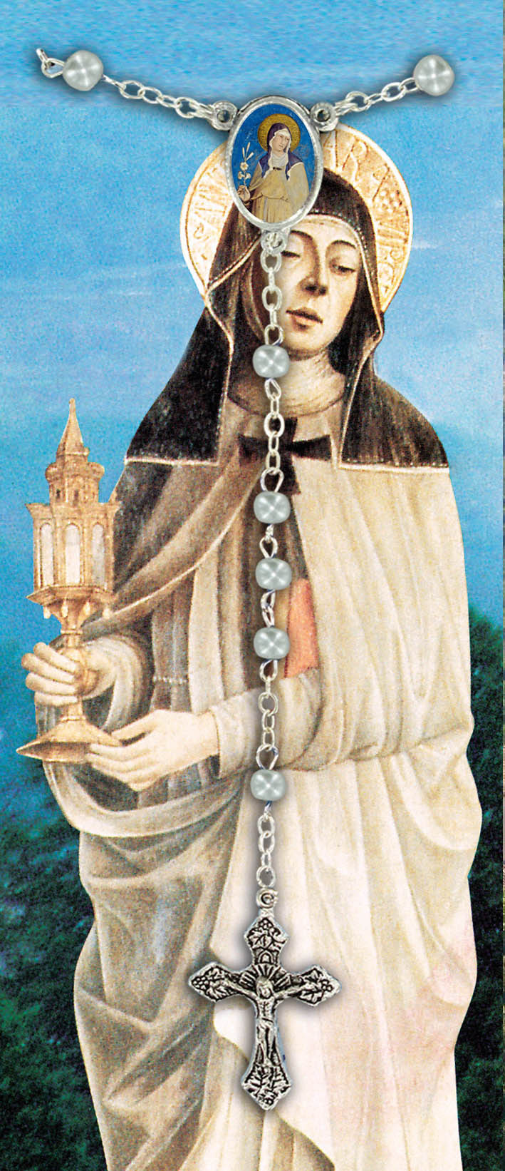 Il libretto, composto da 16 pagine, si presenta con una copertina in plastica trasparente e nell'interno vi è un piccolo rosario con i grani tipo perlina del diamero di mm 4. Nell'interno troviamo la spiegazione di come recitare il Santo Rosario e una preghiera dedicata a Santa Chiara.La misura è di cm 9,5 x14,5. Realizzato e stampato in Italia. (Il rosario potrebbe variare in base alla disponibilità)