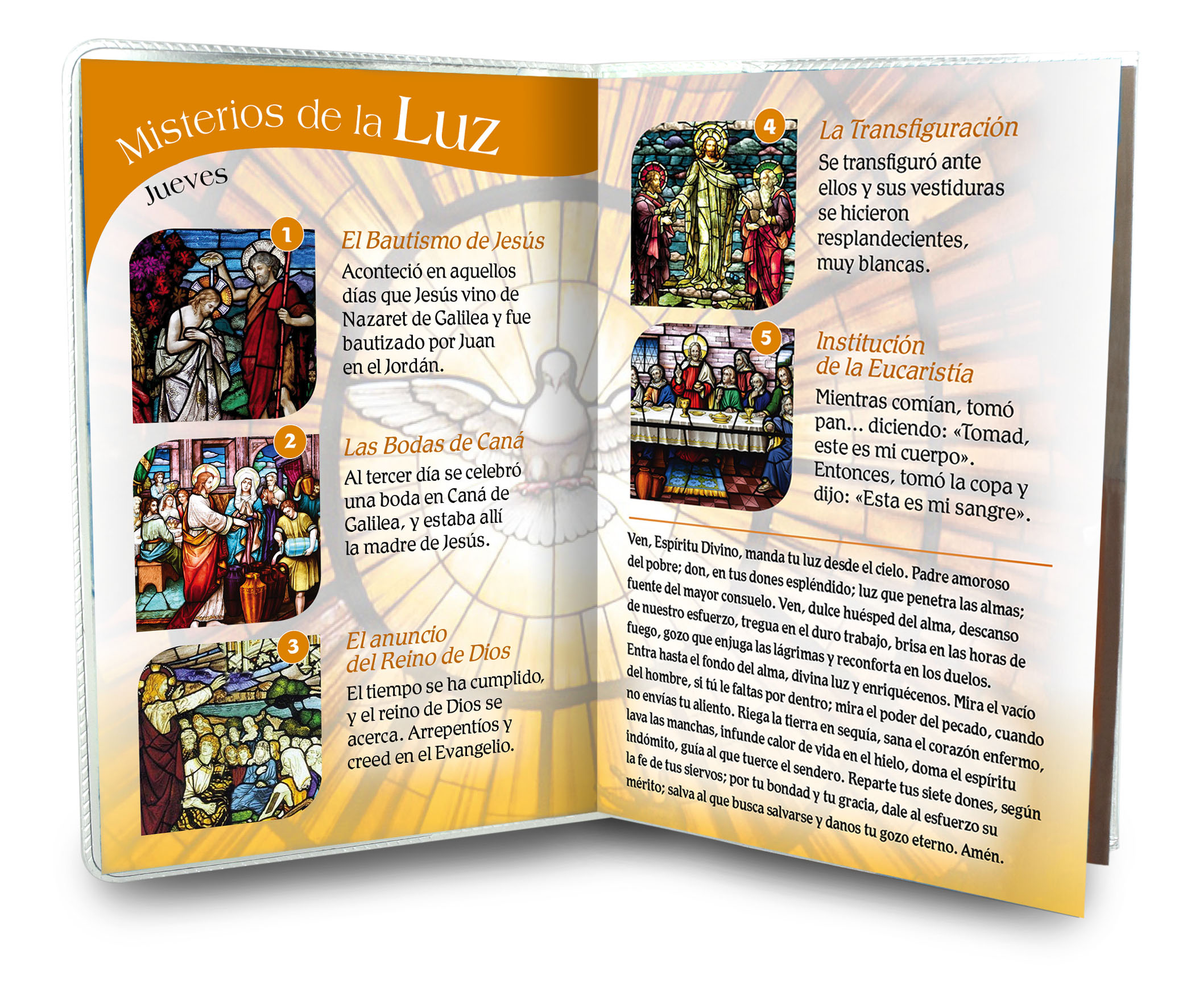 Il libretto, composto da 16 pagine, si presenta con una copertina in plastica trasparente e nell'interno vi è un piccolo rosario con i grani tipo perlina del diamero di mm 4. Nell'interno troviamo la spiegazione di come recitare il Santo Rosario ed una preghiera dedicata allo Spirito Santo.La misura è di cm 9,5 x14. Realizzato e stampato in Italia. (Il rosario potrebbe variare in base alla disponibilità)