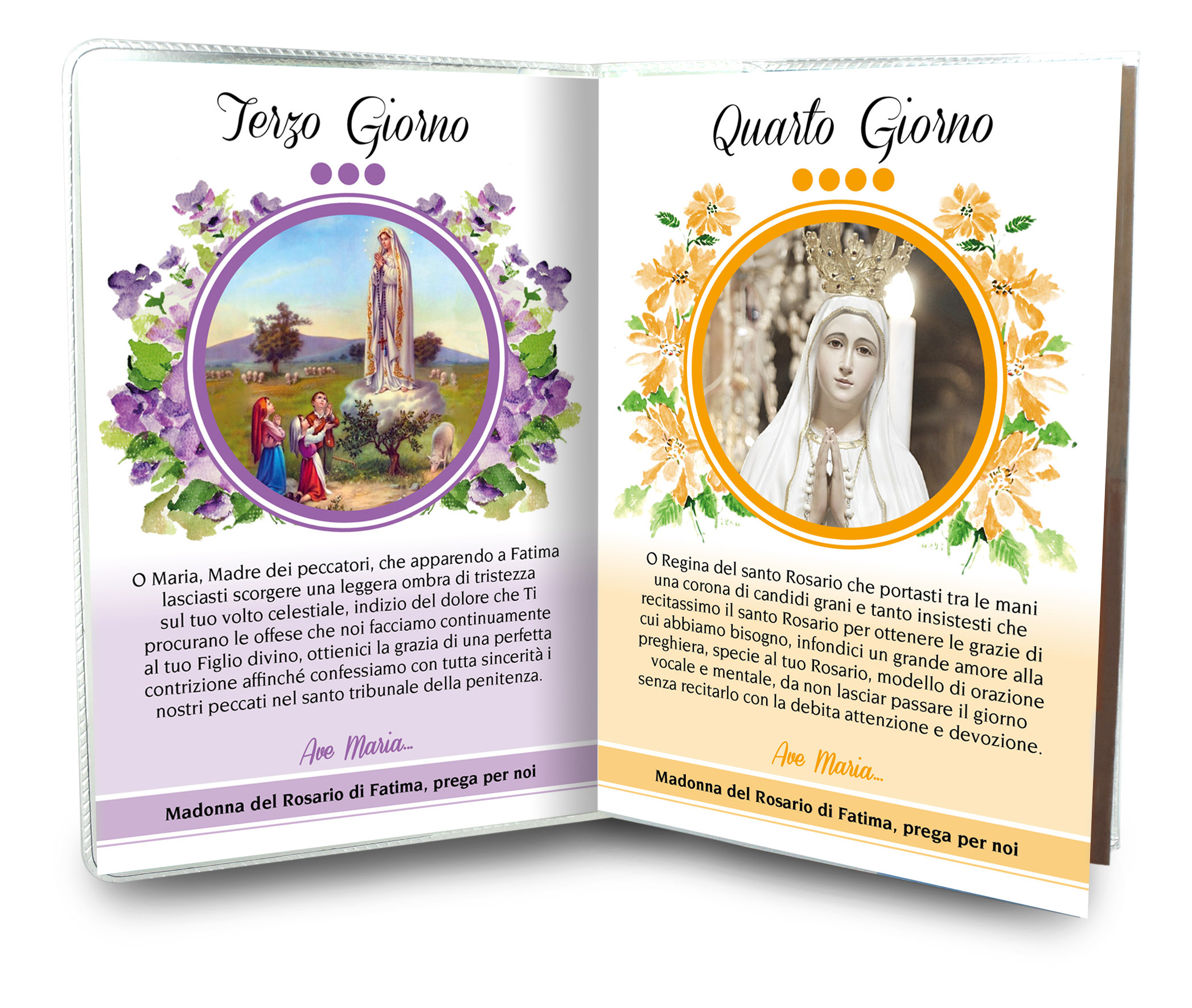 Il libretto, composto da 16 pagine, si presenta con una copertina in plastica trasparente e nell'interno vi è un piccolo rosario con i grani tipo perlina del diamero di mm 4. Nell'interno troviamo le invocazioni della novena alla Madonna di Fatima e una preghiera a lei dedicata.La misura è di cm 9,5 x14,5.Il peso è di grammi 0,50.Realizzato e stampato in Italia. (Il rosario potrebbe variare in base alla disponibilità)