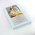Tavola raffigurante la Madonna di Lourdes con la preghiera dell'Ave Maria scritta in FRANCESE.Matriale: legno colorato azzurro. Dimensioni: 26 x 12,5 cm. Ideale come regalo per la camera dei bambini.Realizzato in Italia.