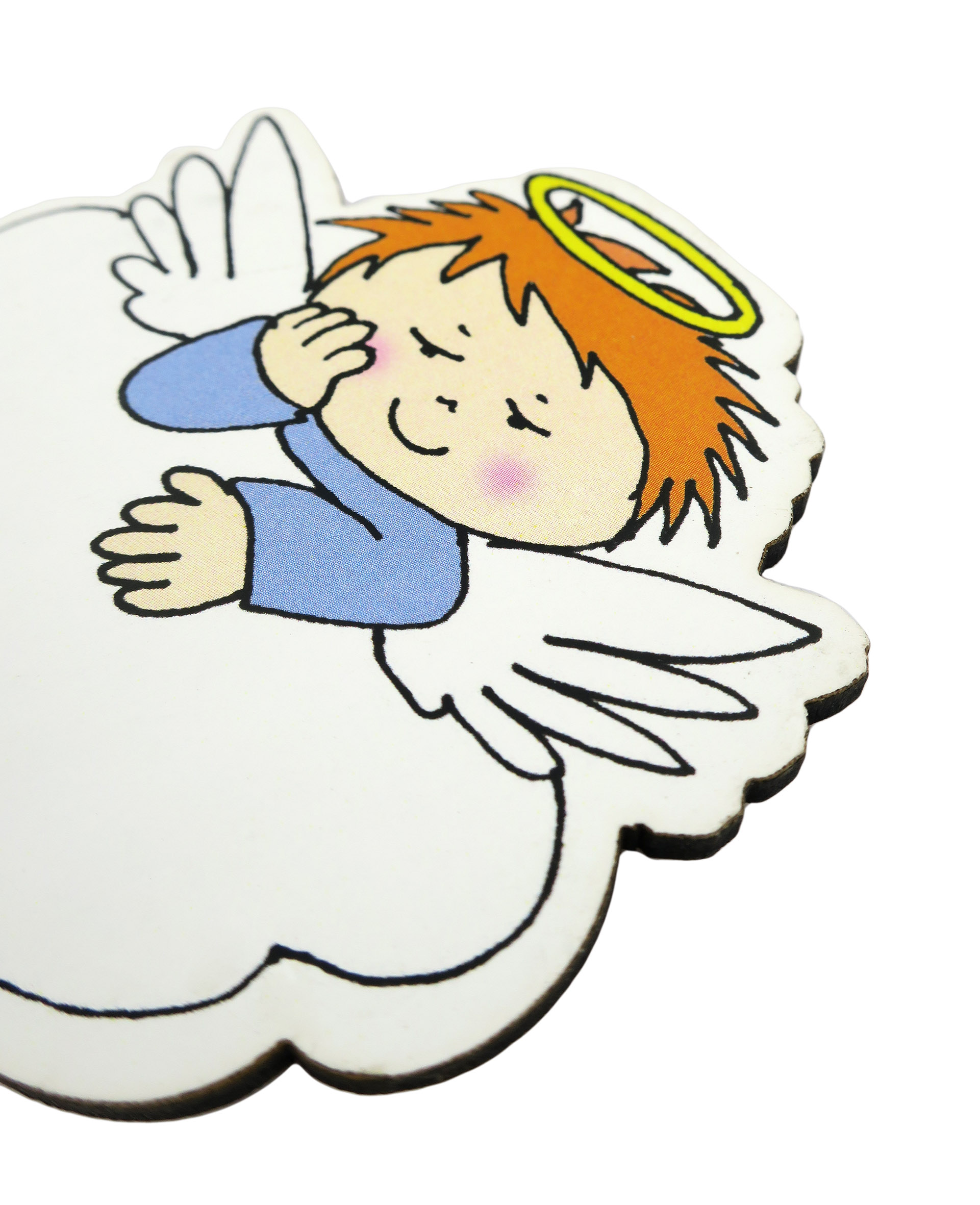 La calamita colorata è in legno mdf a forma di angelo custode.Il magnete, le cui misure sono cm 6,5 x 6,5 cm, è confezionato singolarmente in una bustina trasparente.spazio compilabile con il nome del bambinoRealizzato in Italia.