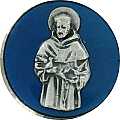 Calamita con forma ottagonale, in metallo nichelato con smalto blu che circonda la placchetta in metallo, raffigurante San Francesco. La misura della calamita è di 4 cm.Realizzato in Italia.