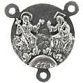 Crocera tonda per rosario realizzata in metallo ossidato, e sulla quale è raffigurato il simbolo dello Spirito Santo da un lato, e una colomba dall'altro. Realizzato in Italia.