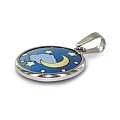 La medaglietta di cm 1,8 rappresenta la luna e le stelle stampate su porcellana con sfondo di colore blù e incastonato in un profilo di argento lucido.Verrà inviata in una scatolina con copercho trasparente e il peso della medaglia è di gr 1,6.Il tutto è realizzato da un azienda italiana in esclusiva per la ditta che la presenta.