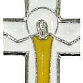 Ciondolo croce in metallo nichelato di misura 4,5 x 2,5 cm.La croce è in metallo, rappresentante Gesù risorto , smaltata di colore bianco e giallo. Questo pendente è disponibile in 2 colori: - Blu/rosso, - Bianco/giallo.REALIZZATO INTERAMENTE IN ITALIA.