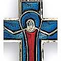 Ciondolo croce in metallo nichelato e smalto, raffigurante Gesù risorto.Misure della croce: 4,5 x 2,5 cm. Questo pendente è disponibile in 2 colori: - Blu/rosso, - Bianco/giallo.Realizzato in Italia.