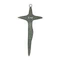 Questa croce in metallo argentato leggermente brunito è di cm 3. Lo stile moderno molto lineare ci presenta un Cristo di semplici fattezze. La confezione è di 100 pz.Realizzato in Italia.