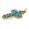 La croce è realizzata in zama con una finitura dorata, che avviene attraverso un procedimento galvanico.Le decorazioni all'interno della croce sono stampate su carta e rivestite da una resina trasparente che le rende lucide.La croce ha un altezza di cm 3,3,misura che comprende l'anello fisso,ed una larghezza di cm 2.Realizzato in Italia.