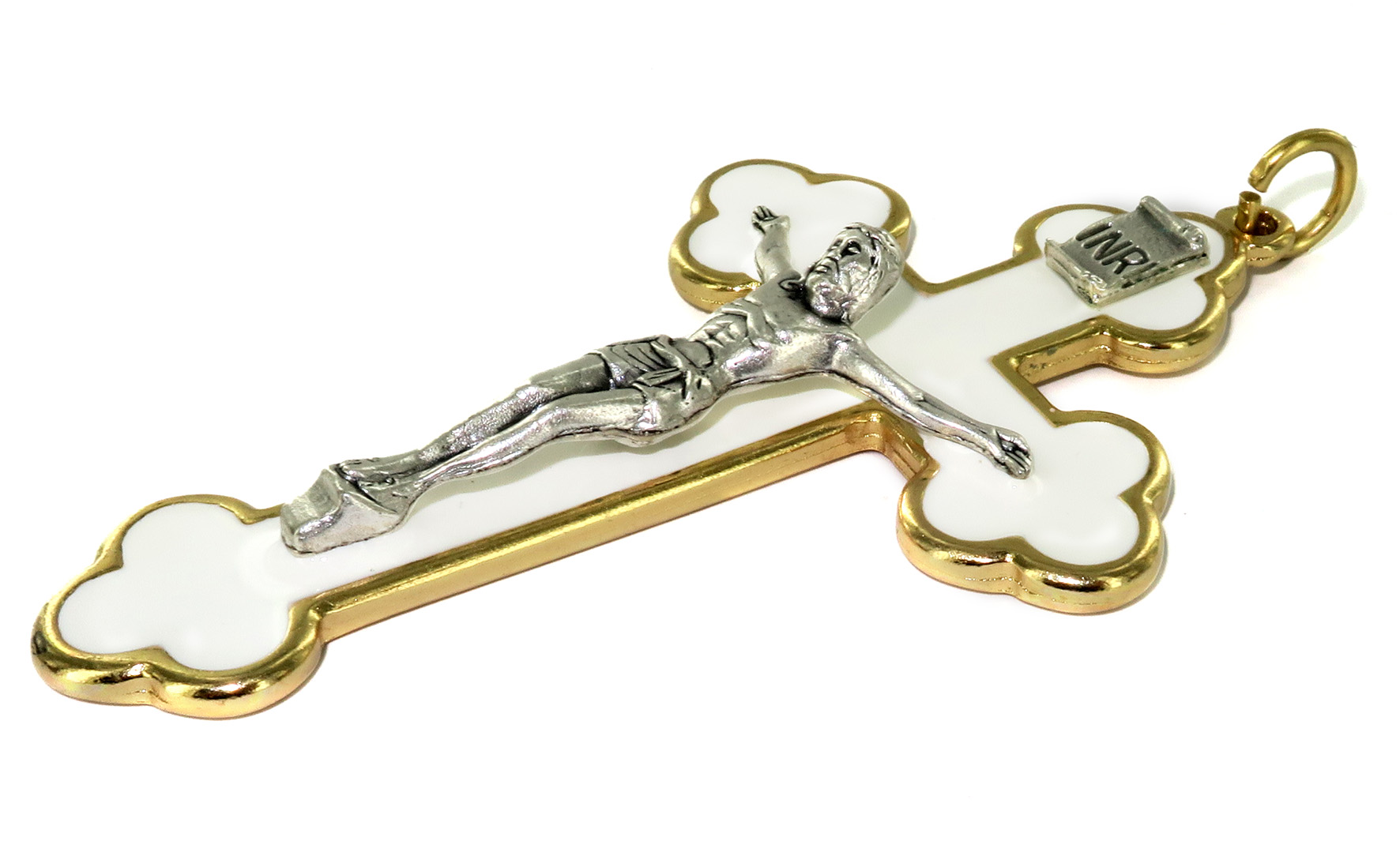 Croce in metallo dorato con smalto bianco e Cristo riportato con bordi a fiore.La misura della croce è 8 x 4 cm.Prodotto realizzato in Italia.