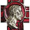 Croce raffigurante il volto di Cristo di profilo da 2 cm.Materiale: metallo dorato con smalto rosso. Realizzato in Italia.