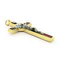 Croce di San Benedetto in ottone dorato lucido con sfondo in smalto rosso e con il corpo di Cristo in metallo argentato. Altezza della croce: 5 cm. La croce è dotata di un pratico gancio per mettere il cordoncino o la catena.