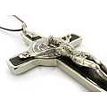 Croce di San Benedetto in legno con Cristo in metallo argentato. Altezza della croce: 8 cm. Prodotto in Italia.