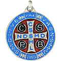 La medaglia del diametro di cm. 3 è in metallo argentato con smalto ad anello di San Benedetto.Sul retro vi è la croce che reca nei toni dei bracci alcune iscrizioni simboliche. Peso gr. 10Realizzato in Italia.