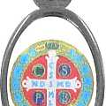 Medaglia raffigurante la Croce di San Benedetto. L'immagine della Croce è ricoperta da uno strato di resina trasparente che rende i colori lucidi e ben visibili. Il prodotto misura 2,5 cm ed è realizzato in ITALIA.