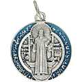 Medaglia di San Benedetto tonda in metallo argentato con smalto. Altezza della croce: 2,5 cm. Realizzata in Italia.