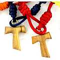 Bracciale decina in corda con croce Tau in legno d'olivo di altezza 2 cm.Il cordoncino è disponibile in diverse colorazioni.La lavorazione lel prodotto è realizzato interamente a mano da artigiani professionisti.Peso: 1,6 gr.