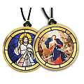 Il ciondolo è costituito da un medaglione tondo in ulivo con, da un lato Maria che scioglie i nodi serigrafata e dall'altro Gesù Misericordioso.La misura del medaglione è di cm 3,5 Il prodotto si presenta con un gancetto in ottone nel quale è inserito un cordoncino in cotone di colore marrone.Realizzato in Italia