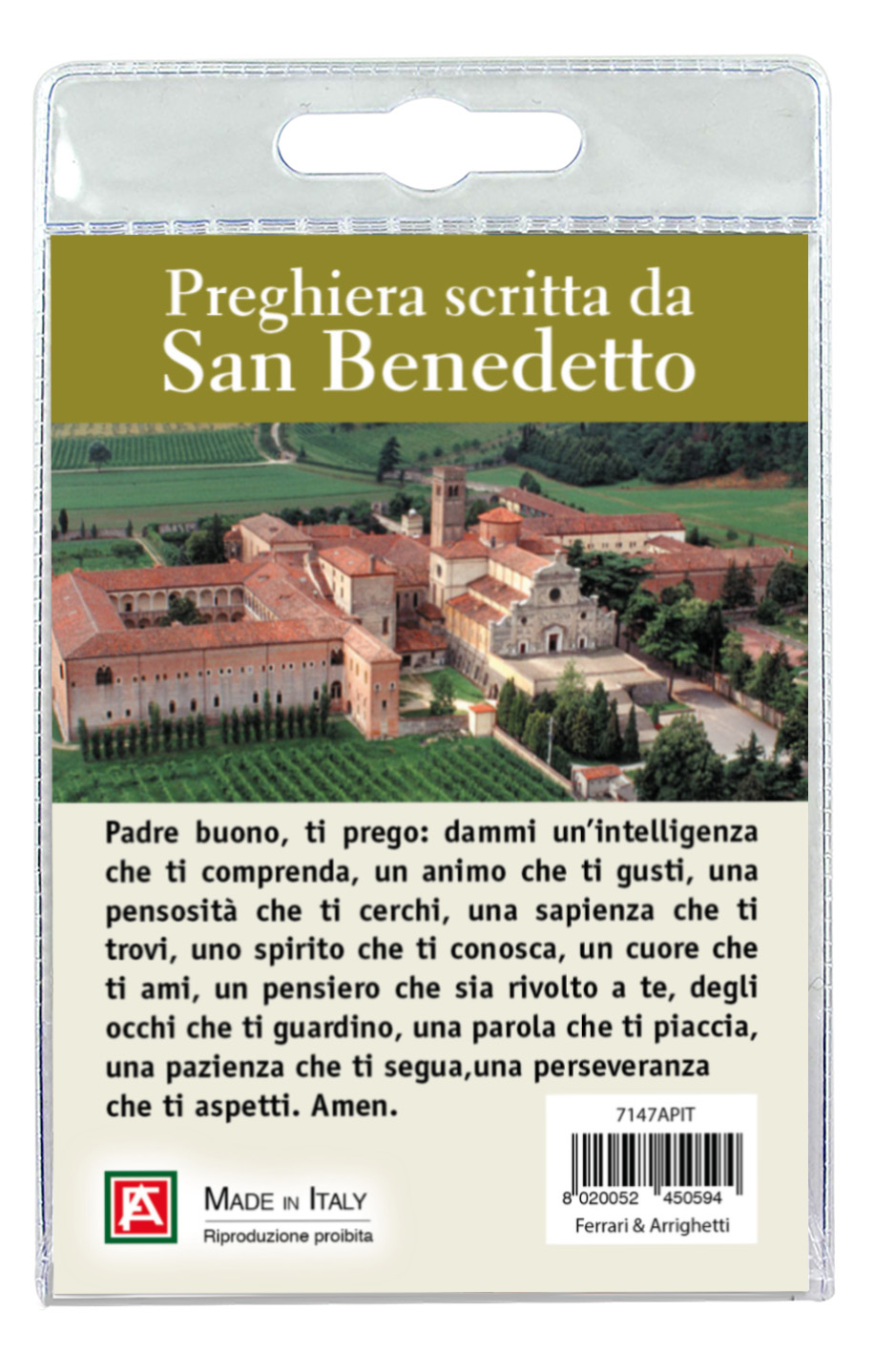 Il Portachiavi è in metallo nichelato con bordo smaltato di colore azurro.Sulle due facce del portachiavi sono raffigurati San Benedetto e la croce di San Benedetto;entrambe le immagini sono realizzate con un adesivo resinato.Il portachiave si presenta confezionato in un blister con all'interno un cartoncino, rappresentante l'Abbazia di Praglia (monastero benedettino),sul cui retro è stampata una preghiera scritta da San Benedetto.La lunghezza complessiva del portachiave è di cm 10 mentre quella della sola medaglia,comprensiva di anello fisso,è di 5 centimetri.