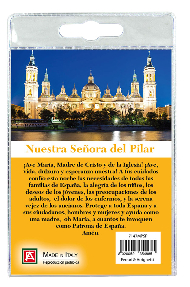 Il blister si presenta con all'interno un cartoncino, rappresentante Madonna del Pilar.Sul retro del cartoncino vi è stampata l'immagine di Madonna del Pilar.Il Portachiavi è in metallo nichelato, all'interno del quale vi è l'immagine resinata.Uno smalto messo a mano attornia l'immagine.Realizzato in Italia.
