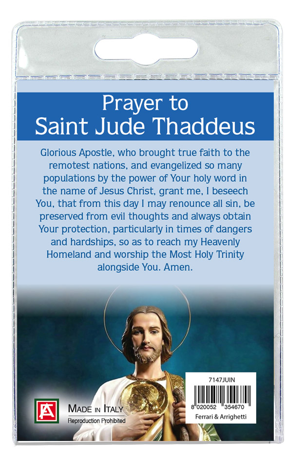 Il blister si presenta con all'interno un cartoncino, rappresentante San Giuda Taddeo.Sul retro del cartoncino vi è stampata l'immagine del Santuario.Il portachiave è in metallo nichelato, all'interno del quale vi è la figura del Santo.Uno smalto messo a mano attornia l'immagineRealizzato in Italia.