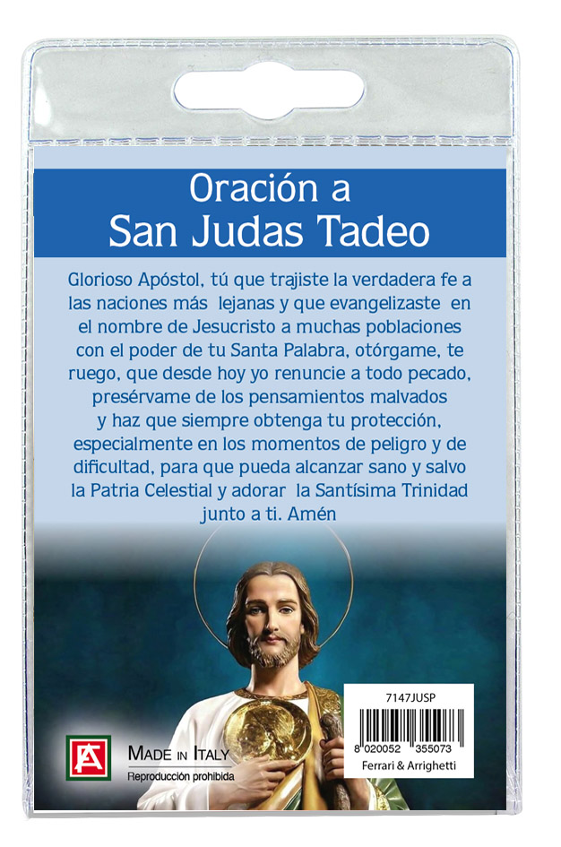 Il blister si presenta con all'interno un cartoncino, rappresentante San Giuda Taddeo.Sul retro del cartoncino vi è stampata l'immagine del Santuario.Il portachiave è in metallo nichelato, all'interno del quale vi è la figura del Santo.Uno smalto messo a mano attornia l'immagineRealizzato in Italia