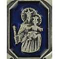 Portachiavi in metallo nichelato a forma di pergamena con smalto blu che circonda la placchetta in metallo raffigurante la Madonna Ausiliatrice. Il prodotto è completamente realizzato in Italia.