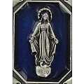 Portachiavi in metallo nichelato a forma di pergamena con smalto blu che circonda la placchetta in metallo raffigurante la Madonna Miracolosa. Il prodotto è completamente realizzato in Italia.