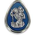 Portachiavi in metallo nichelato a forma di goccia con smalto blu che circonda la placchetta in metallo raffigurante San Cristoforo. Il prodotto è completamente realizzato in Italia.