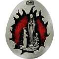 STOCK:Portachiavi in metallo a forma di goccia con smalto rosso che circonda la placchetta in metalloraffigurante la Madonna di Lourdes.Il prodotto è realizzato interamente in Italia.