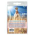Portachiavi con decina e medaglia realizzato in legno d'ulivo raffigurante la Madonna di Fatima.L'immagine è ricoperta da uno strato di resina. La decina ha una legatura in corda colorata.Il Portachiavi è confezionato in un blister con all'interno un immagine dell'apparizione di Fatima sul cui retro è stampata una preghiera in portoghese.Realizzato in Italia.