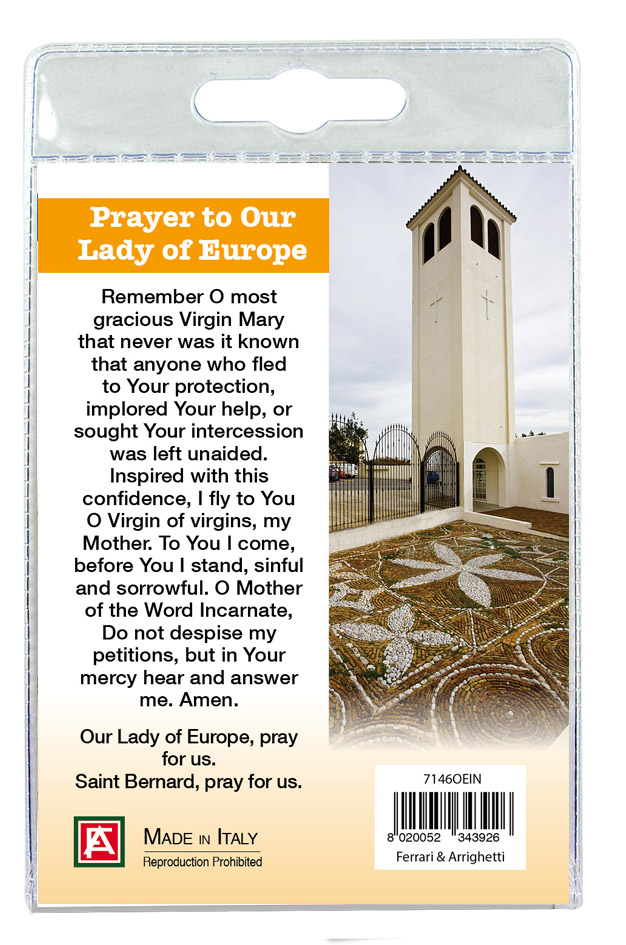 Portachiavi con decina e medaglia in legno d'ulivo raffigurante Our Lady of EuropeL'immagine e' ricoperta da uno strato di resina.La decina ha una legatura in corda colorata.Il Portachiavi è confezionato in un blister con all'interno un immagine di Our Lady of Europe sul cui retro è stampata una preghiera a lei dedicata *(in inglese).Realizzato in Italia.