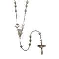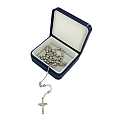 Il rosario ha i grani a forma di cubetto, grani che sono bloccati sulla catena.Il tutto è in argento 925 rodiato ed ha la chiusura a fianco della crociera che rappresenta la Vergine Miracolosa. La croce ha Cristo stampato e misura cm 3. La lunghezza del rosario è di cm 80 e la circonferenza è di cm 64. Peso: gr. 7Materiale: argento 925 rodiatoRealizzato in Italia.