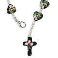 Braccialetto cloisonnè con 11 grani a forma di cuore e la croce di altezza 2 cm con base di colore nero e legatura in metallo.La tecnica artistica del cloisonné è antichissima, addirittura conosciuta nell'antico Egitto, dai Goti e dai Longobardi e consiste nella pittura a mano con smalto di ogni grano e nel contornare ogni elemento con filo metallico brillante. Con questa tecnica sono stati realizzati i fiorellini di colore rosa presenti sui grani e sulla croce. La circonferenza del braccialetto è 16 cm. Peso: 9,8 gr. Realizzato in Italia.