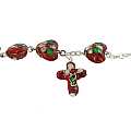 Bracciale Rosario cloisonnè con 11 grani a forma di cuore e la croce di altezza 2 cm con base di colore rosso e legatura in metallo.La tecnica artistica del cloisonné è antichissima, addirittura conosciuta nell'antico Egitto, dai Goti e dai Longobardi e consiste nella pittura a mano con smalto di ogni grano e nel contornare ogni elemento con filo metallico brillante. Con questa tecnica sono stati realizzati i fiorellini di colore rosa presenti sui grani e sulla croce. La circonferenza del braccialetto è 16 cm. Peso: 9,8 gr. Realizzato in Italia.