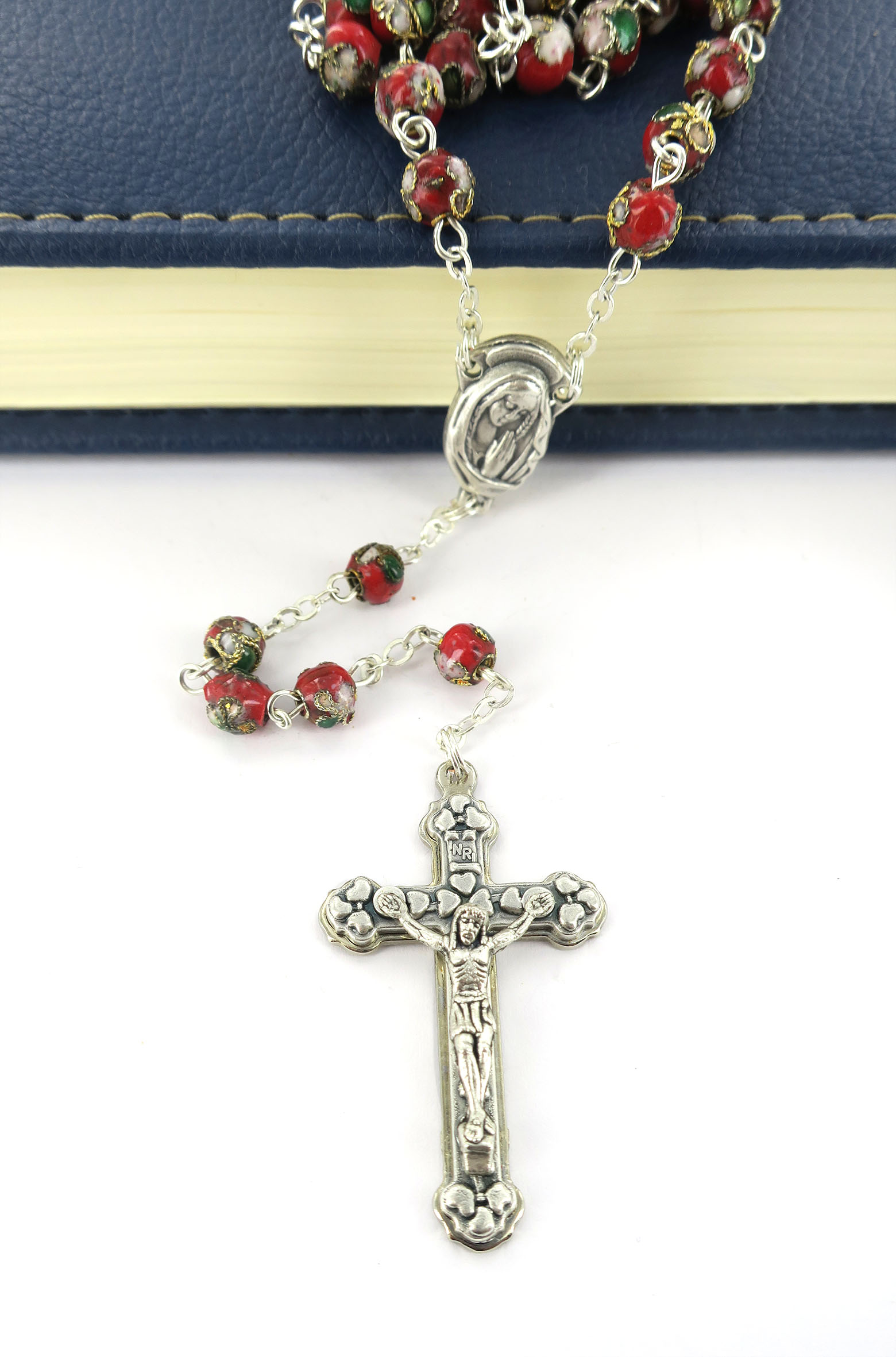 Rosario in cloisonnè con grani tondi da 5 mm di diametro.Legatura fatta a mano con grani rotondi colore rosso in metallo smaltato e decorato.Sulla Crociera è visibile da un lato l'immagine della Madonna e dall'altro l'immagine del Sacro cuore di Gesù.Realizzato in Italia.*Il Santo Rosario è stato l'oggetto delle più vigile attenzione e premurosa sollecitudine da parte di tutti i Pontefici, che hanno visto il Rosario come una preghiera contemplativa che è insieme di lode e di supplica, efficace nel promuovere la vita cristiana e l'impegno apostolico. Anche Paolo VI e Giovanni Paolo II più volte hanno rivolto ai cristiani un appello perchè fossero innalzate supplici preghiere alla Beata Vergine del Rosario, per implorare da Dio il bene supremo della pace e il risveglio della vita cristiana.