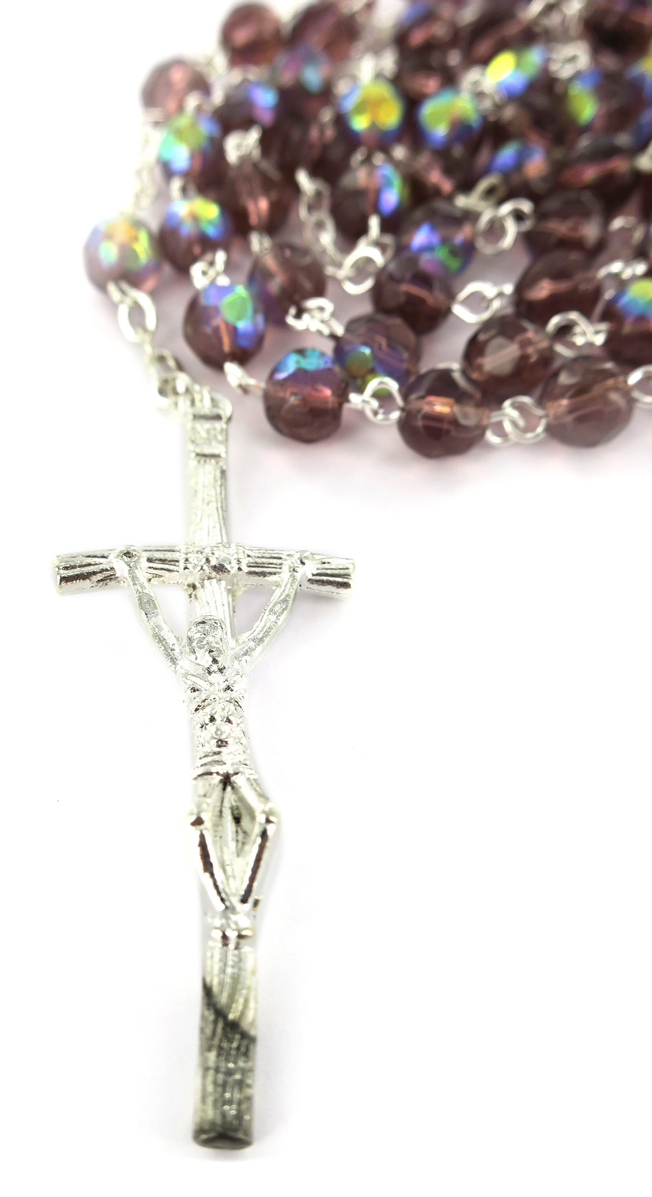 Rosario con grani in semicristallo di colore ametista la cui misura è 6 millimetri.La legatura,cosi' come la croce,è realizzata in metallo argentato.