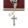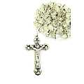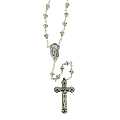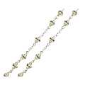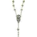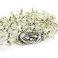 La luminosità di questo rosario,rilegato a mano in metallo argentato, è dovuta ai grani in semicristallo trasparente biaco impreziositi da un piccolo anello in strass bianchi.La crocera in metallo argentato rappresenta la Vergine Maria e la croce anch'essa in metallo argentato misura cm 4,5.La lunghezza del rosario è di cm. 59 e il peso è di gr.29.Totalmente made in Italy