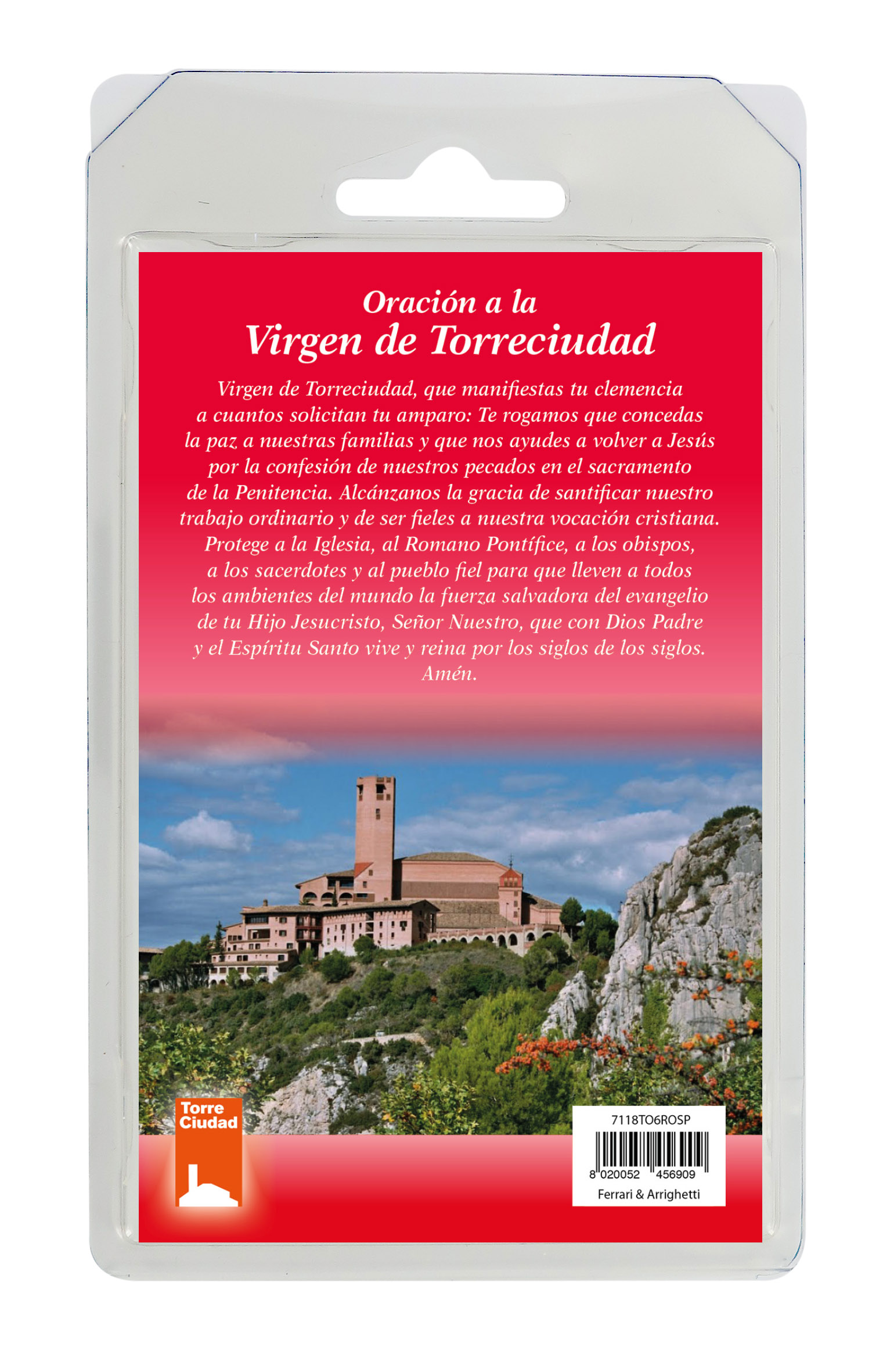 Rosario con grani in semicristallo rosso di millimetri 6 con legatura in metallo.Si presenta confezionato in una scatolina in plastica rigida trasparente al cui interno troviamo un cartoncino con l'immagine della Vergine di Torreciudad sul cui retro è stampata una preghiera.La preghiera è in spagnolo.