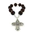 Rosario decina composto da 10 grani in legno scuro (Ø 8 mm) e una croce metallica pendente. I grani, abbelliti da un motivo circolare inciso, sono fissi sulla legatura e non scorrono. Il design della croce è piuttosto elaborato, con diversi soggetti ritratti sulla sua superficie ed estremità arrotondate. Circonferenza: 17 cm.