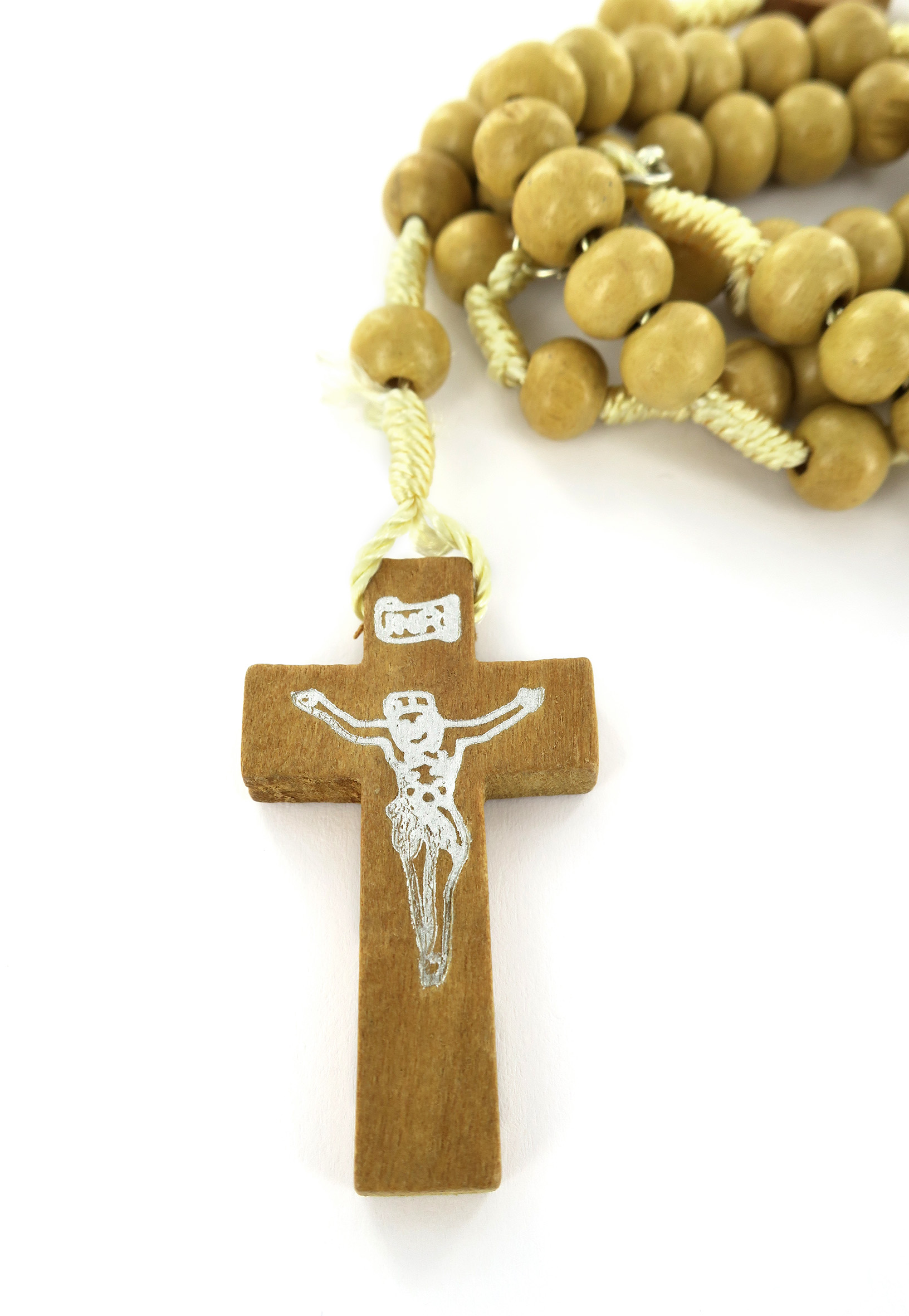 Il rosario con grani in legno tondo di colore grezzo è rilegato a mano con seta di colore grezzo.La particolarità di questo rosario è il moschettone che permette di metterlo al collo con facilità.La crocera e la croce sono in legno e su quest'ultima vi è stampato il cristo stilizzato.La lunghezza del rosario è di cm 35.Il peso del rosario è di gr.11