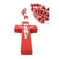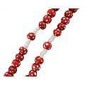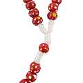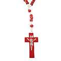 Rosario con grani tondi in legno rosso con fiore bianco e giallo e legatura a mano con filo bianco.Ogni grano è di millimetri 7 e sulla croce in legno è impresso il corpo di Cristo in colore argento.Le misure della croce sono:altezza:4 cmlarghezza:2,5 cmQuesto rosario è disponibile anche nei colori blu,bianco,verde,giallo.