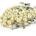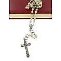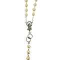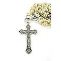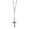 Il rosario si presenta con grani imitazione perla mm 7 di color bianco ecrù, i grani del pater sono rappresentati da due piccoli anelli che si intrecciano, croce con Cristo riportato, crociera con il Volto di Maria, tutto legato a mano in metallo ossidato.La croce con Cristo riportato misura cm 3,5 la crociera con il volto di Maria misura cm 2La lunghezza del rosario è di cm 49 e la circonferenza è di cm 66.Peso: 46 gr.Tutto completamente made in Italy.